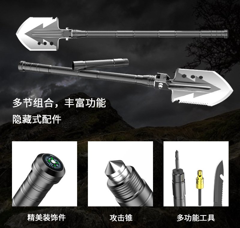Versatile Use: Functions as a shovel, axe, hoe, saw, hammer, compass, whistle, and more.